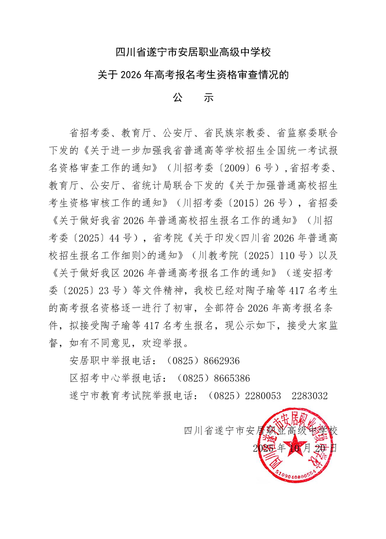 四川省遂宁市安居职业高级中学校关于2026年高考报名考生资格审查情况的公示