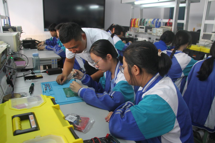 陆金虎在给学生讲解电子产品硬件焊接操作步骤。